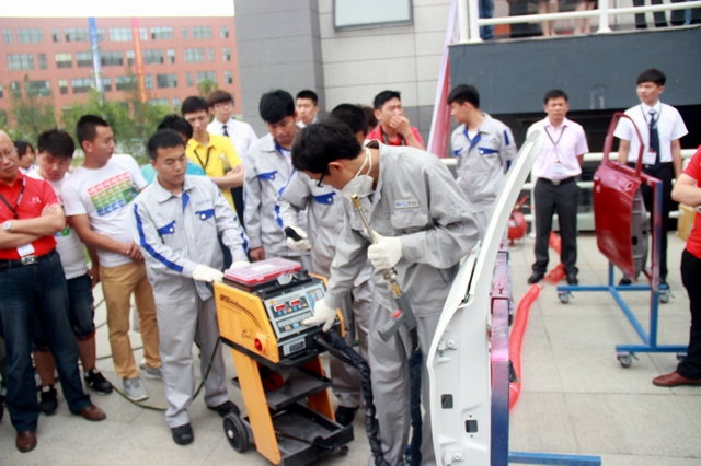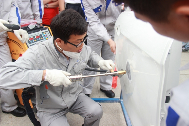 在两天的时间里,孟老师和他的学生进行了多场表演。为了增强演绎效果,他们还增加了互动环节。现场请出几位观众用大锤对准完好的车门砸去,几个大坑出现在崭新的车门上,经过“破坏者”确认后,孟老师和学生们先拿起打磨机去掉漆膜,再用介子机进行修复,经过再次打磨、焊点、吹气、脱脂等一系列工序后,坑坑哇哇的车门就神奇的平整如初了,现场观众报以热烈的掌声。