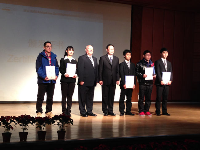 2014年 12月12日上午,中国教育国际交流协会成功举行了中德职业教育汽车机电合作项目(SGAVE)首批毕业生颁证仪式。出席仪式的有教育部职成司、教育部国际合作与交流司欧洲合作处、德国驻华使馆、GIZ代表、德国5大车企代表、SGAVE项目中方秘书处、第一批SGAVE试点院校毕业生代表及全国25所SGAVE项目院校领导及教师代表。我校汽车运用学院焦传君院长和孙华伟同学应邀参加了此次颁证仪式,孙华伟同学作为毕业生代表在会上发言。