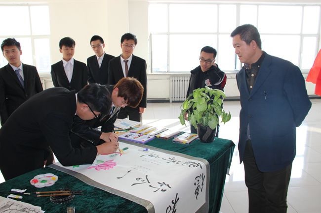 2014年12月22日,机械工程学院在六号楼五楼举办了“德能并进•知行合一”书画摄影展。明晓辉副校长、胡国良校长助理为书画摄影展剪彩,学校各部门负责人及部分师生纷纷前来参展。