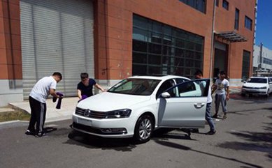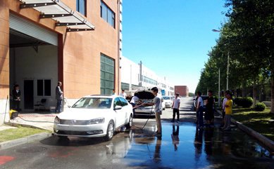 次日,赛场布置与技术保障组成员在汽车综合实训楼对大赛场地进行清空。何英俊、王立超带领多名青年教师和学生,将18辆大赛所需的一汽-大众迈腾轿车进行清洗,并完成赛场车辆的布置工作。