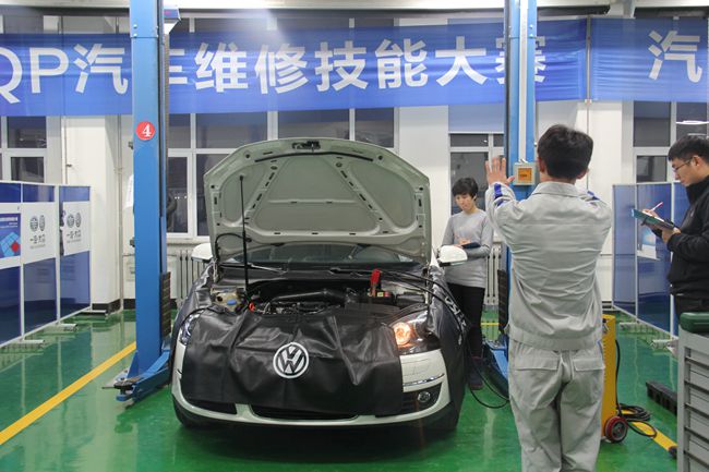 本次复赛内容为大众车系10000公里保养标准化操作,共设置4个工位同时进行。比赛裁判由汽车运用学院电气教研室主任张军、发动机教研室主任田丰福、底盘教研室主任李明清、长白山技能名师孙雪梅以及专业教师何英俊、杨金玉、郭其涛、叶鹏、汪月英组成。