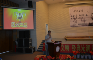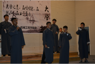在激烈的掌声中大会进入《大学》的学习汇报环节。汇报分为团体赛以及个人赛。团体赛中参赛团体根据抽签结果背诵大学选段,评委根据评分标准进行打分。个人赛中参赛选手根据抽签顺序号进行十分钟演讲,讲述自己学习《大学》的感悟。比赛间隙还穿插着精彩的节目表演。经过激烈的角逐数控四年制班荣获团体赛一等奖、数控三班刘赫同学荣获个人赛一等奖。