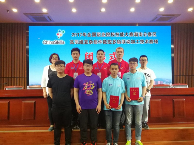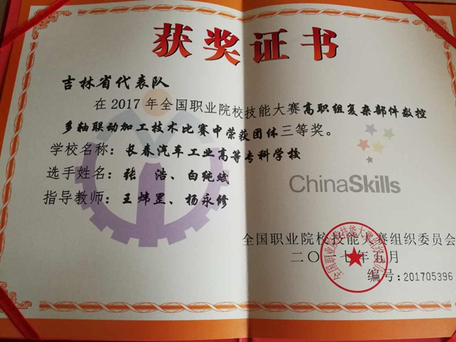 2017年5月24日至27日,2017年全国职业院校技能大赛高职组“复杂部件数控多轴联动加工技术”赛项在湖南省长沙市湖南工业职业技术学院举行。共有来自全国27个省、直辖市的代表队参赛。我校选派魏建军为领队,王炜罡、杨永修为指导教师,张浩、白纯斌为参赛选手,组成参赛队代表吉林省参赛。经过激烈角逐,吉林省代表队最终荣获全国职业院校技能大赛高职组“复杂部件数控多轴联动加工技术”团体三等奖。