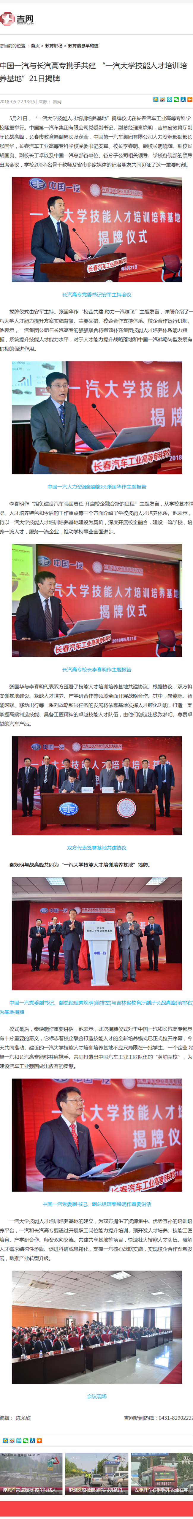 吉网(中国吉林网)——中国一汽与长汽高专携手共建 “一汽大学技能人才培训培养基地”21日揭牌
