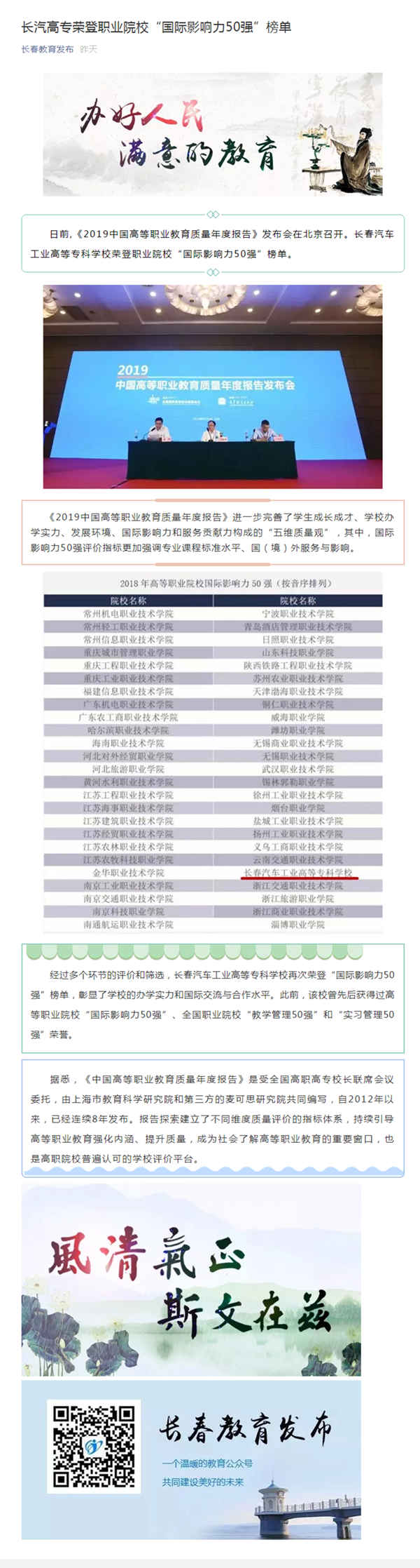 长春教育发布——长汽高专荣登职业院校“国际影响力50强”榜单