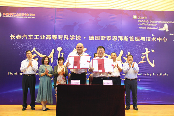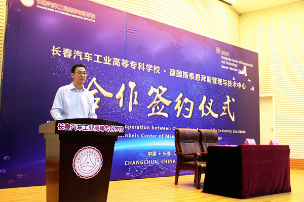 2019年9月5日上午10:30,长春汽车工业高等专科学校与德国斯泰恩拜斯管理与技术中心合作项目签约仪式,在长春汽车工业高等专科学校图书馆报告厅举行。德国斯泰恩拜斯大学创始人、斯泰恩拜斯管理与技术中心总裁、斯泰恩拜斯大学管理与技术学院院长沃尔特·贝克、德国哈尔博格学院院长王缜、北京埃尔伯格国际教育科技发展公司总经理郭晶、长春市教育局副局长张茂金、长春市教育局职成处处长张德文,我校党委书记安军、校长李春明、副校长明晓辉、副校长胡国良、副校长丁卓等学校领导参加了签约仪式。签约仪式由丁卓副校长主持。