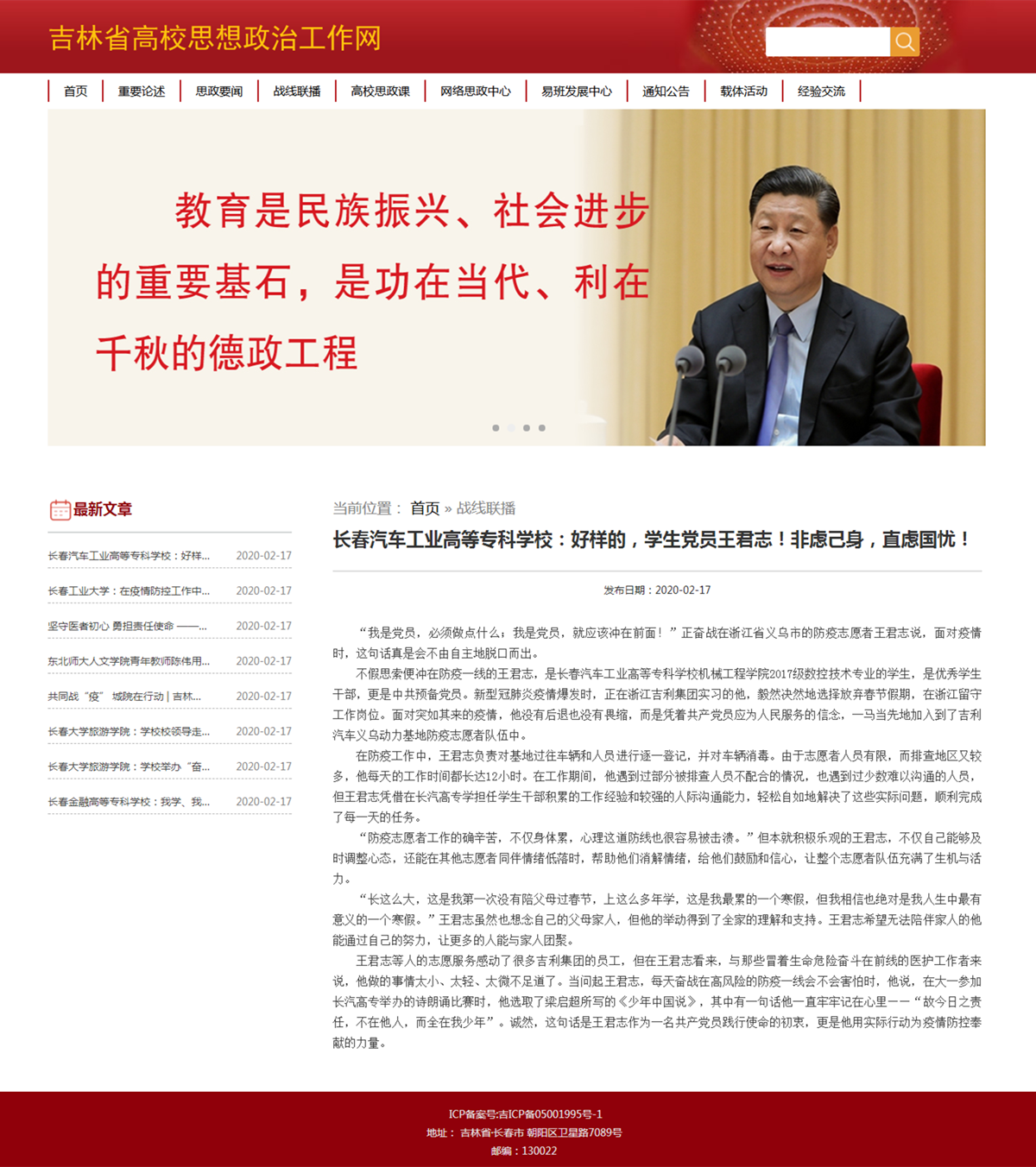 吉林省高校思想政治工作网——长春汽车工业高等专科学校:好样的,学生党员王君志!非虑己身,直虑国忧!