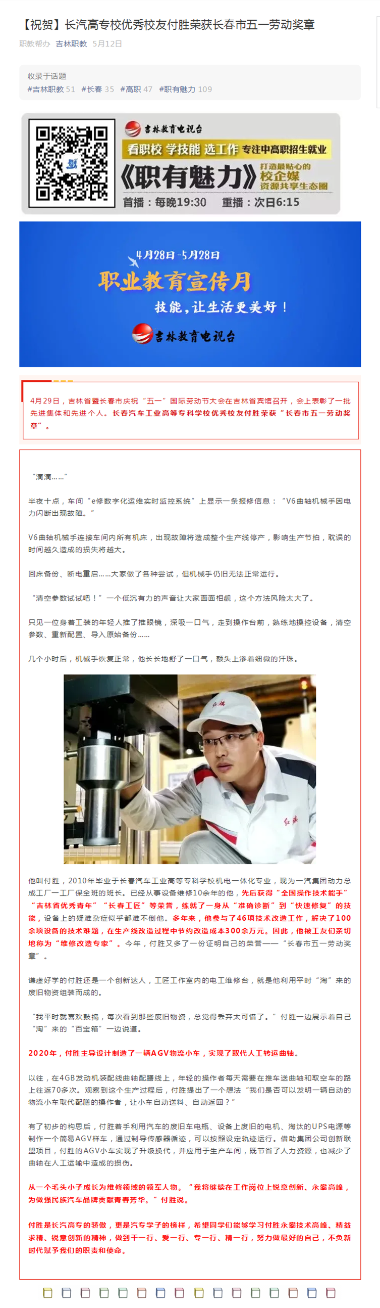 吉林职教——【祝贺】长汽高专优秀校友付胜荣获长春市五一劳动奖章