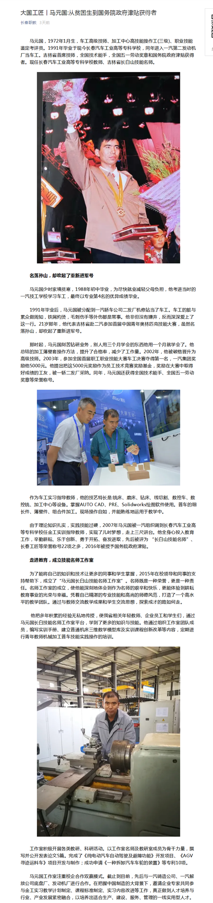 长春职教——大国工匠丨马元国_从贫困生到国务院政府津贴获得者