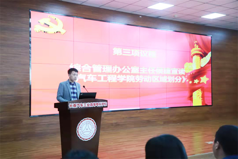 综合管理办公室主任侯建宣读了《汽车工程学院劳动区域划分》和《汽车工程学院实训区、办公区、教室卫生标准》。