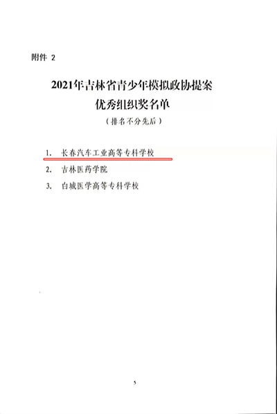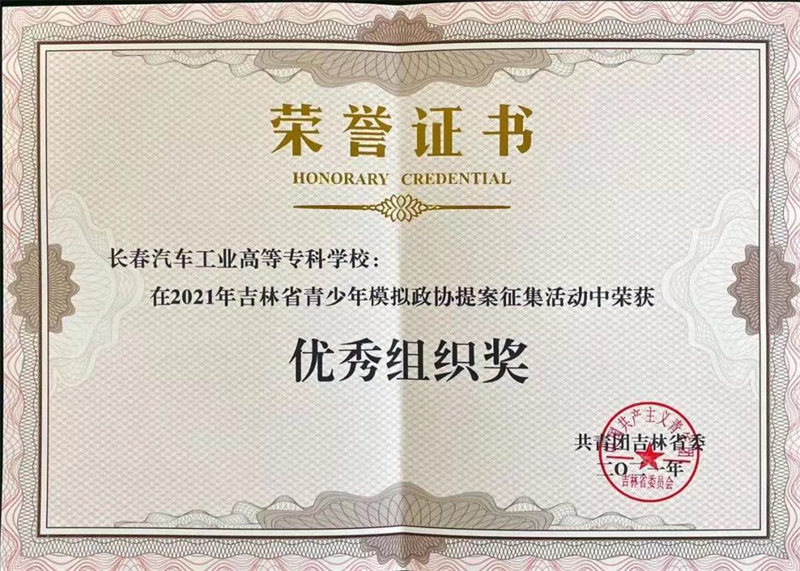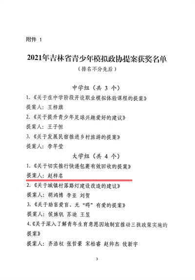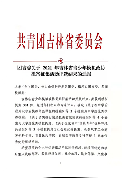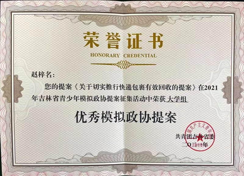 近日,共青团吉林省委公布评选结果,我校信息技术学院学生赵梓名提交的《关于切实推行快递包裹有效回收的提案》荣获优秀模拟政协提案奖(指导教师吴思磊)。我校荣获“2021年吉林省青少年模拟政协提案优秀组织奖”。