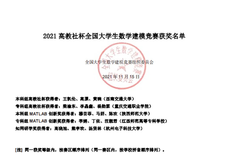 近期,2021年全国大学生数学建模竞赛成绩公示。我校孙日嘉、刘佳睿、胡骏杰三位同学组成的数学建模团队再创佳绩,获得国家二等奖(指导教师孙静茹)。这也是我校连续三年获得该项赛事的国家级奖项。