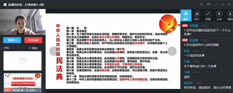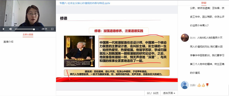 为了加强思政课对大学生的思想引领作用,按照省委教育工委高校思政部要求,充分发挥思政课主渠道作用,本次线上网络直播授课以青春战“疫”为主题,围绕“科学与理性”、“感恩与奉献”、“自由与规则”、“责任与担当”、“尊重与包容”、“逆行与成长”等内容,引导学生担负应有的社会责任,为战胜疫情贡献自己的青春力量。在课堂互动中,教师通过倾听学生心声,对学生进行心理疏导,关注疫情期间学生心理状态也成为本轮线上直播思政课的亮点。