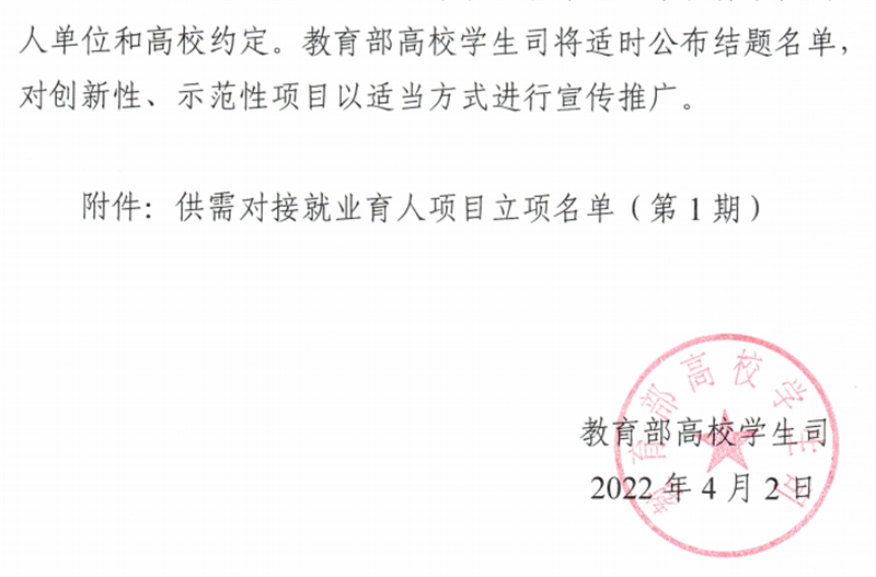 据了解,供需对接就业是为落实党中央、国务院“稳就业”“保就业”决策部署,深化产教融合、校企合作,推动就业与培养有机联动、人才供需有效对接的育人项目,分为定向人才培养培训、就业实践实习基地建设、人力资源提升三类,旨在帮助用人单位培养和招聘更多实用型、复合型和紧缺型人才,促进高校毕业生更加充分更高质量就业。