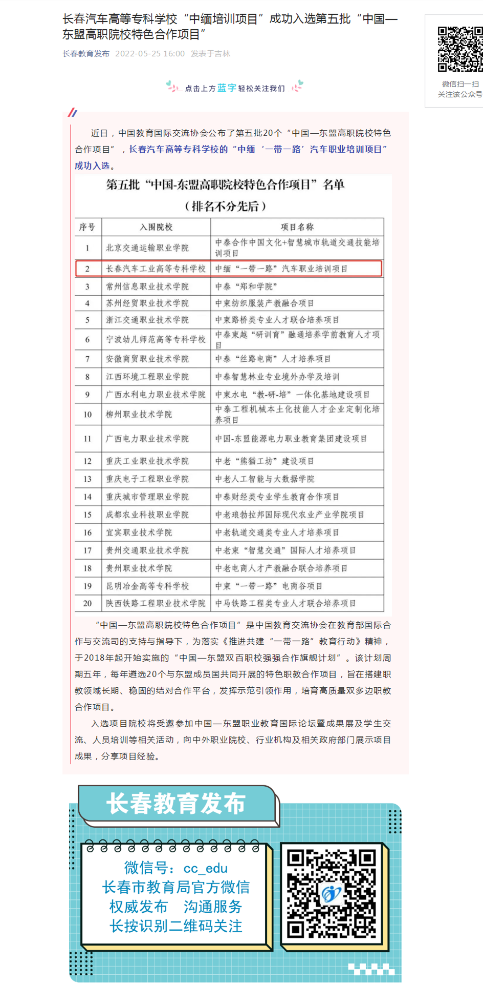 长春教育发布——长春汽车高等专科学校“中缅培训项目”成功入选第五批“中国—东盟高职院校特色合作项目”