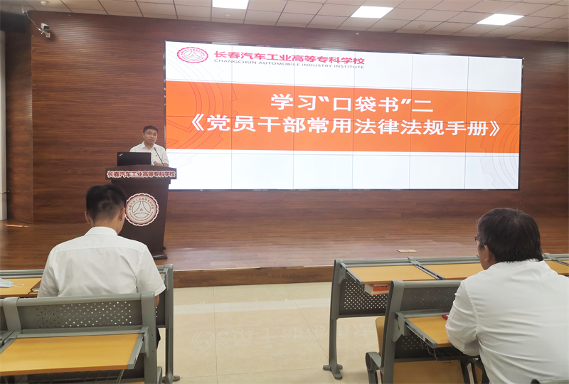 学院党总支纪检委员李文博领学口袋书《党员干部常用法律法规手册》《校园违法违纪典型案例汇编》,以鲜活的案例警示全体教师汲取教训,坚守育人初心,提高政治敏锐度,从思想深处筑起党纪国法和道德意识防线。