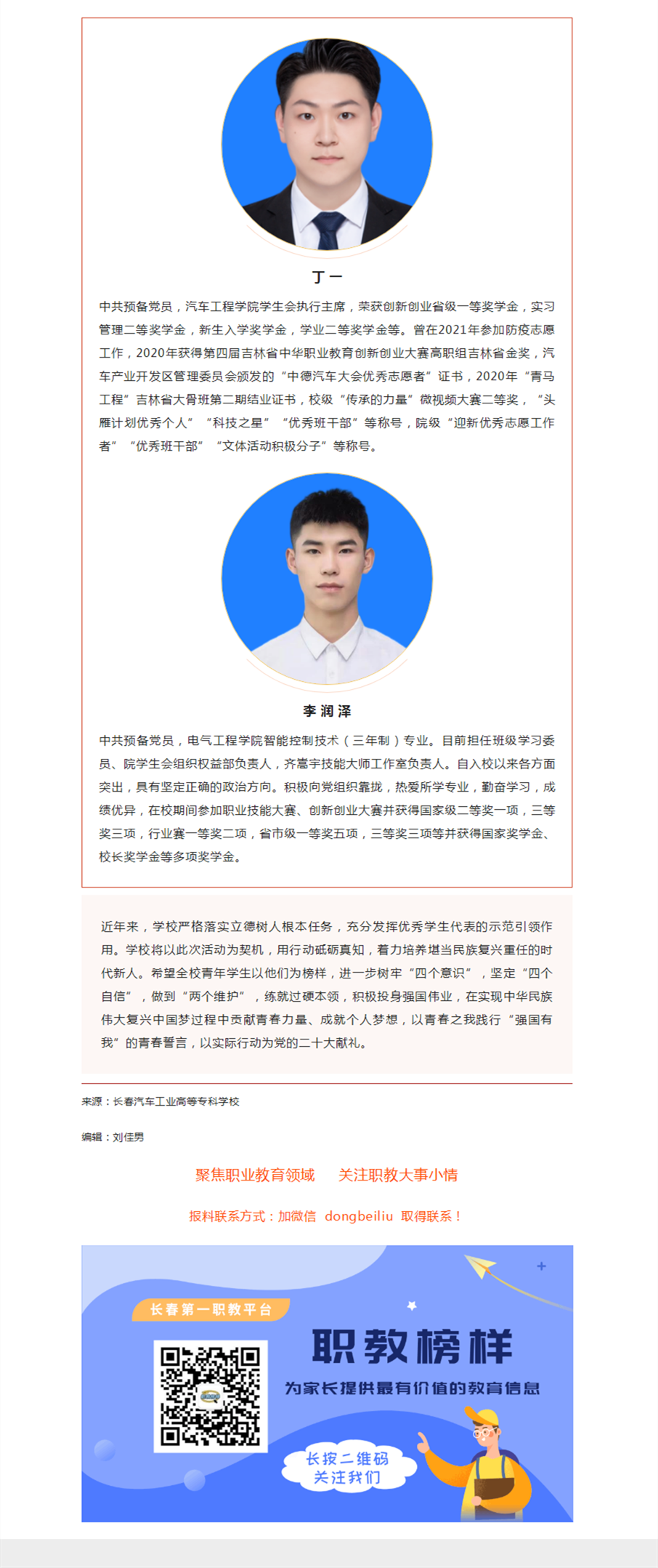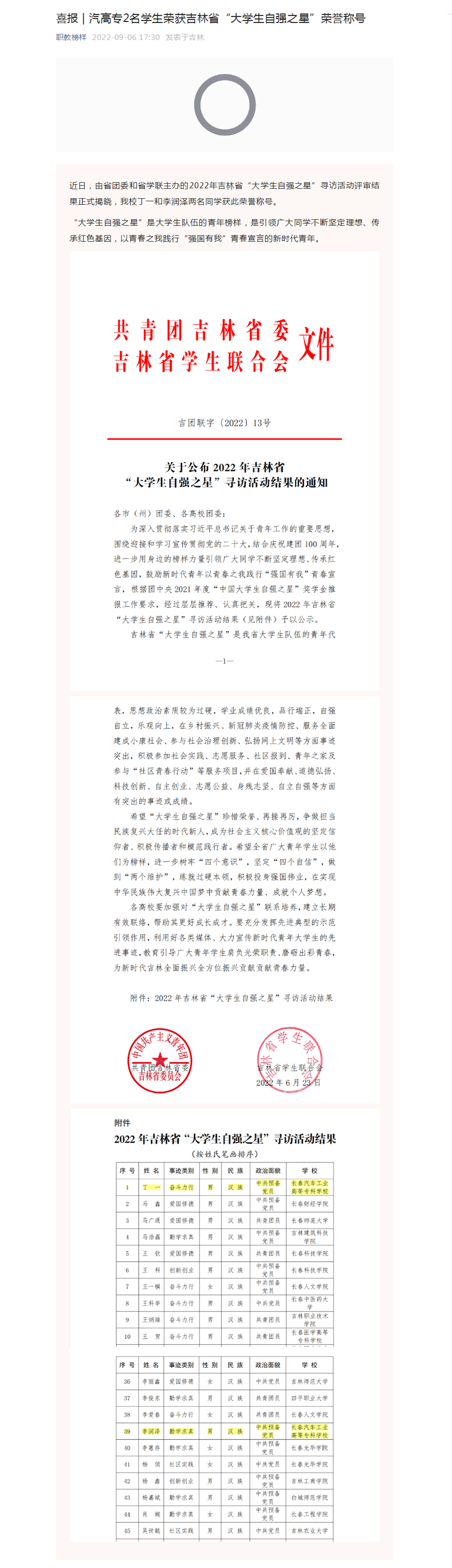 职教榜样——喜报 | 汽高专2名学生荣获吉林省“大学生自强之星”荣誉称号