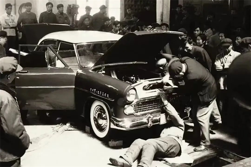 从1958年6月30号开始,一汽工匠是以“赶庙会”的方式,高挂图纸,制作零件,纯手工敲制红旗车身,奋战昼夜33天,开展“人海战术”“连轴转”。