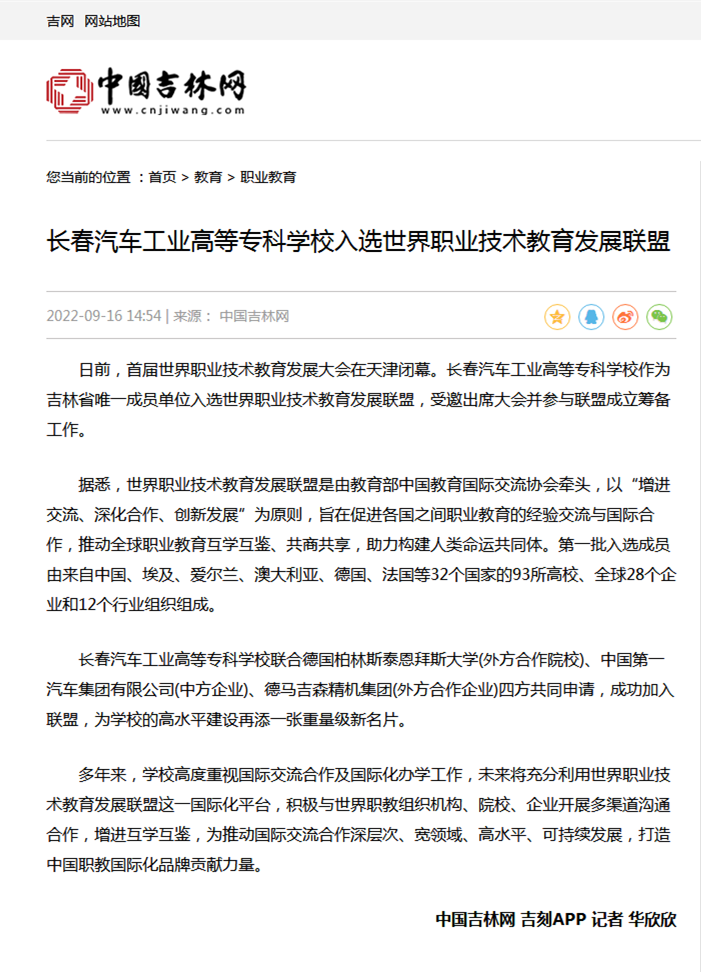 中国吉林网——长春汽车工业高等专科学校入选世界职业技术教育发展联盟