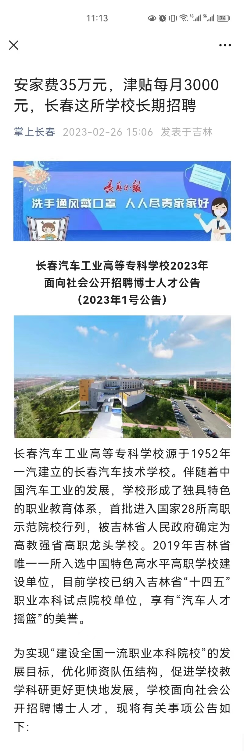 长春日报——安家费35万元,津贴每月3000元,长春这所学校长期招聘