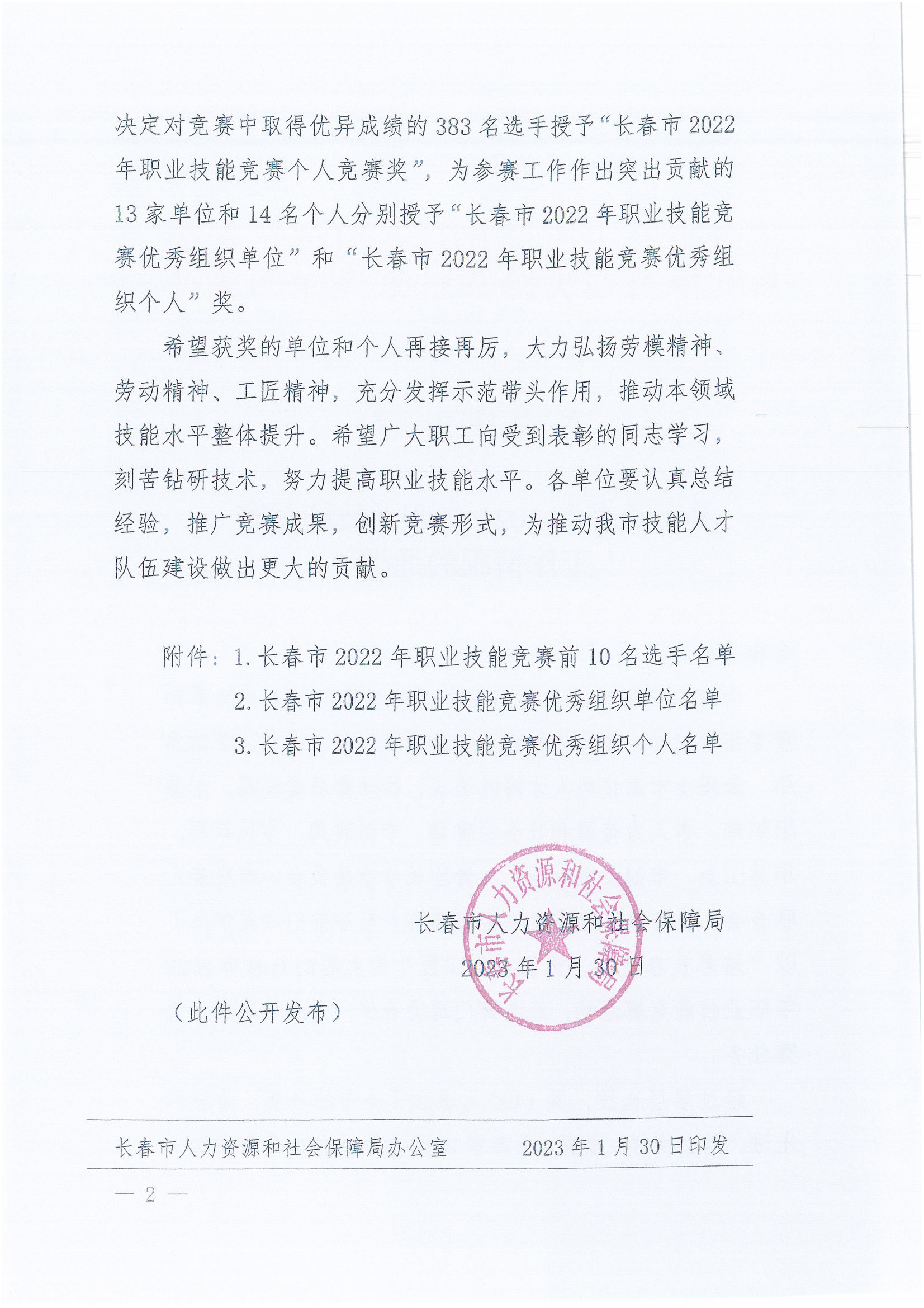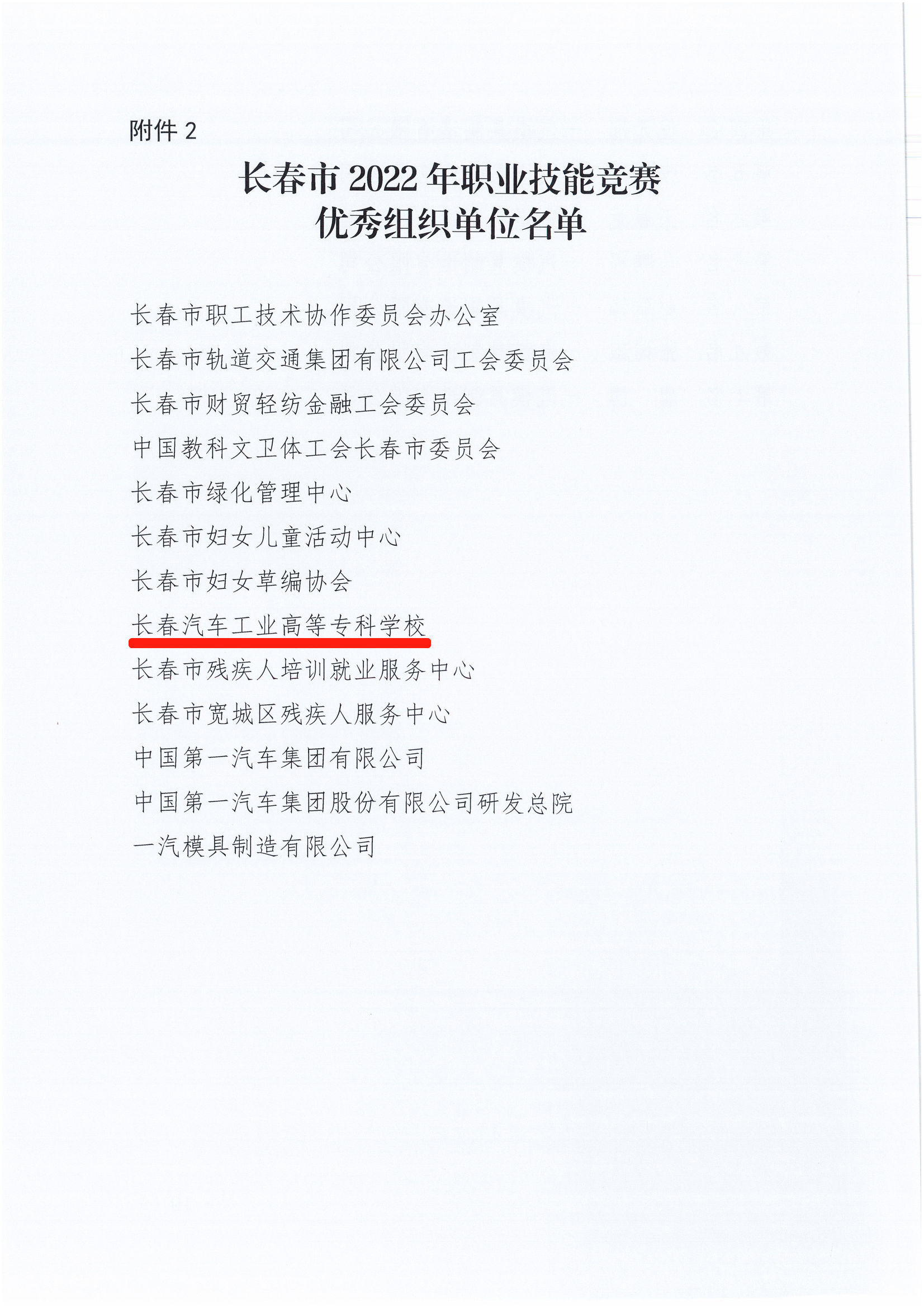 近日,长春市人力资源和社会保障局下发《关于长春市2022年职业技能竞赛工作情况的通报》,公布了长春市2022年职业技能竞赛的优秀组织单位和各赛项前10名评选成果。我校荣获一等奖2项,二等奖3项,三等奖3项,学校获评2022年“优秀组织单位”。