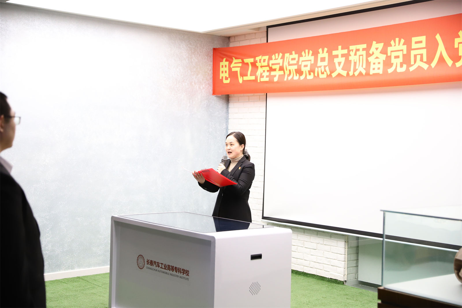 电气工程学院党总支书记颜丹丹向新接收的预备党员表示热烈的祝贺。颜丹丹表示,希望大家树立远大理想,坚定理想信念,严格要求自己,充分发挥共产党员的先锋模范作用,在学习中增长知识,锤炼优良品格,在工作中增长才干,练就过硬本领,成为堪当民族复兴大任的时代新人。