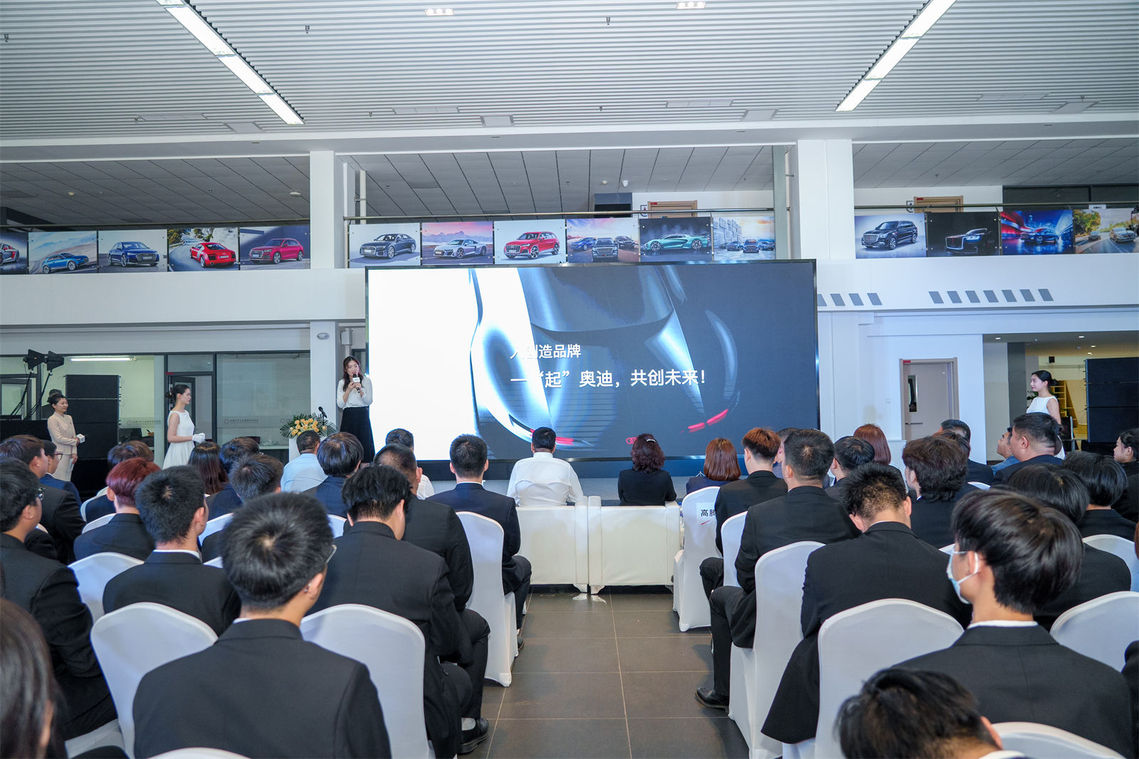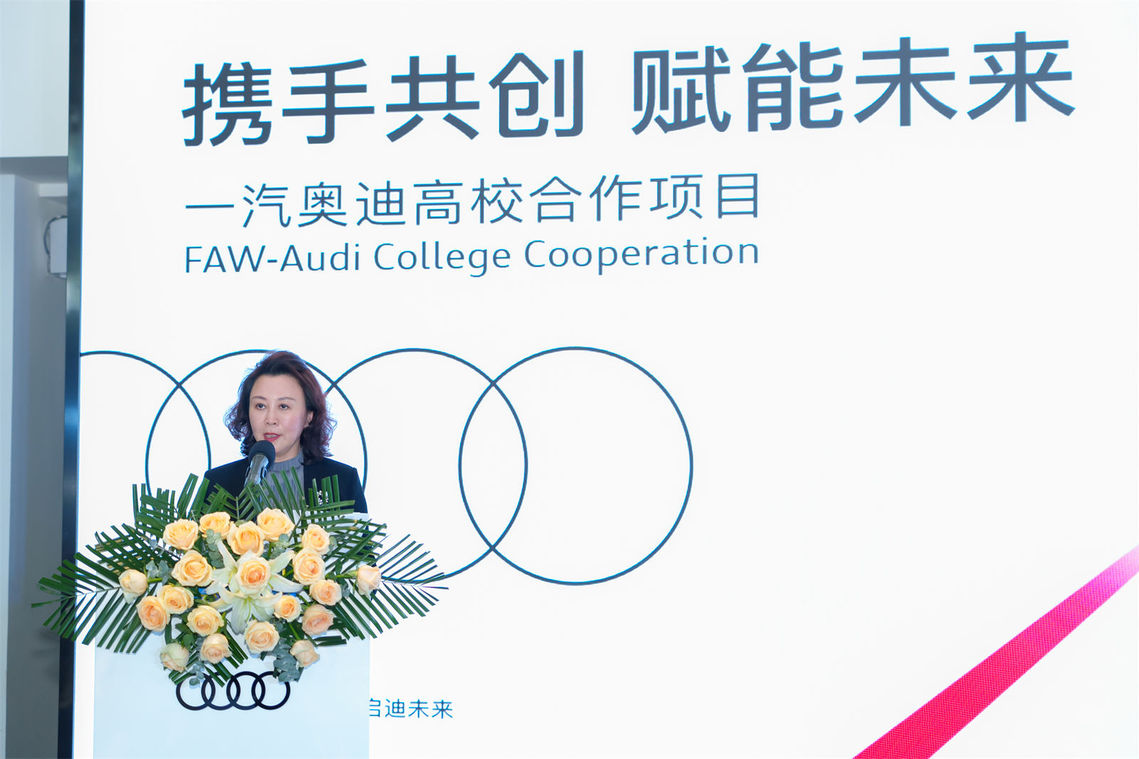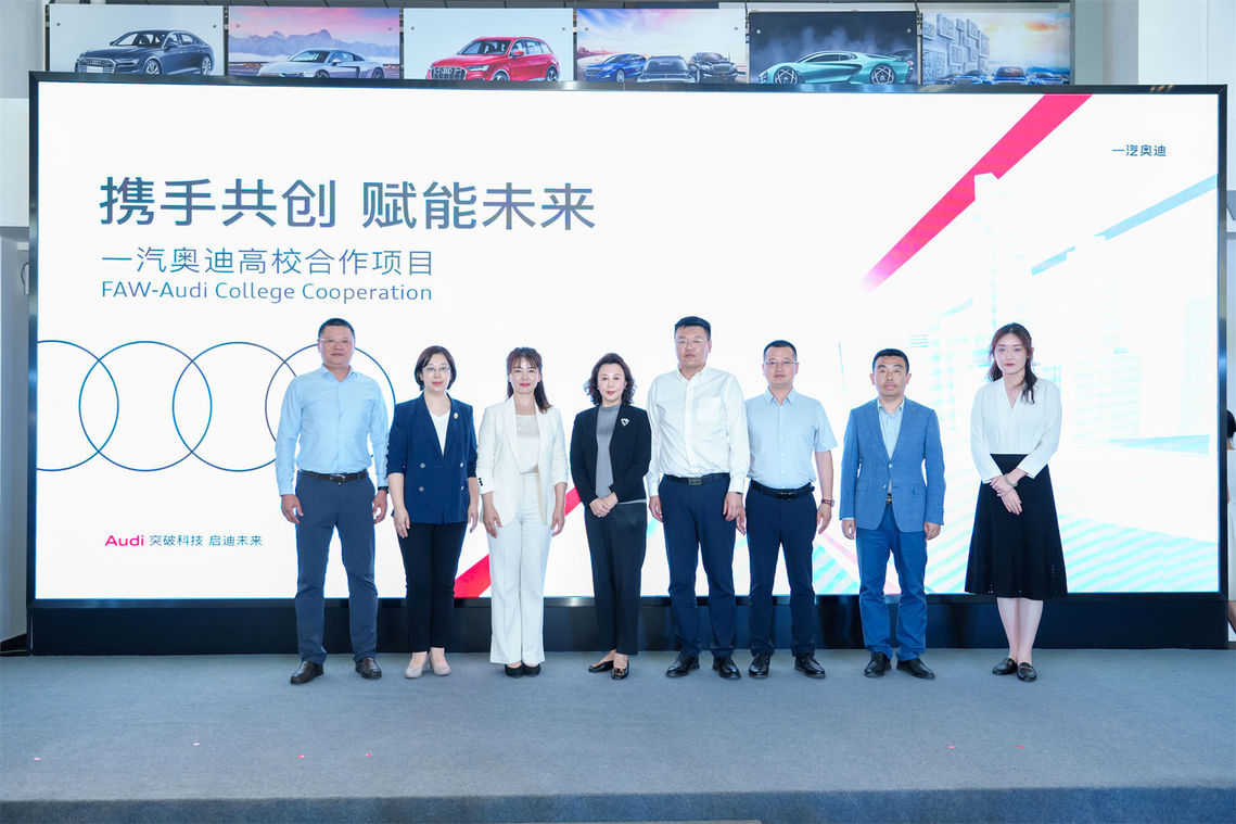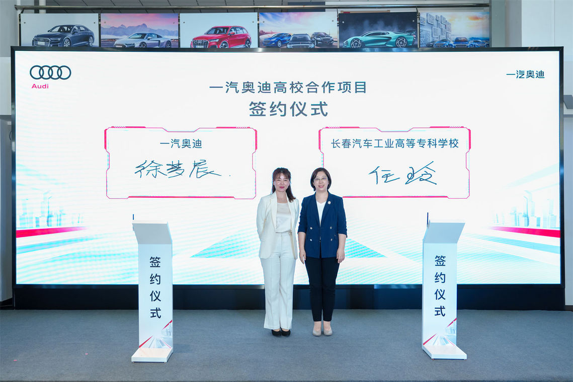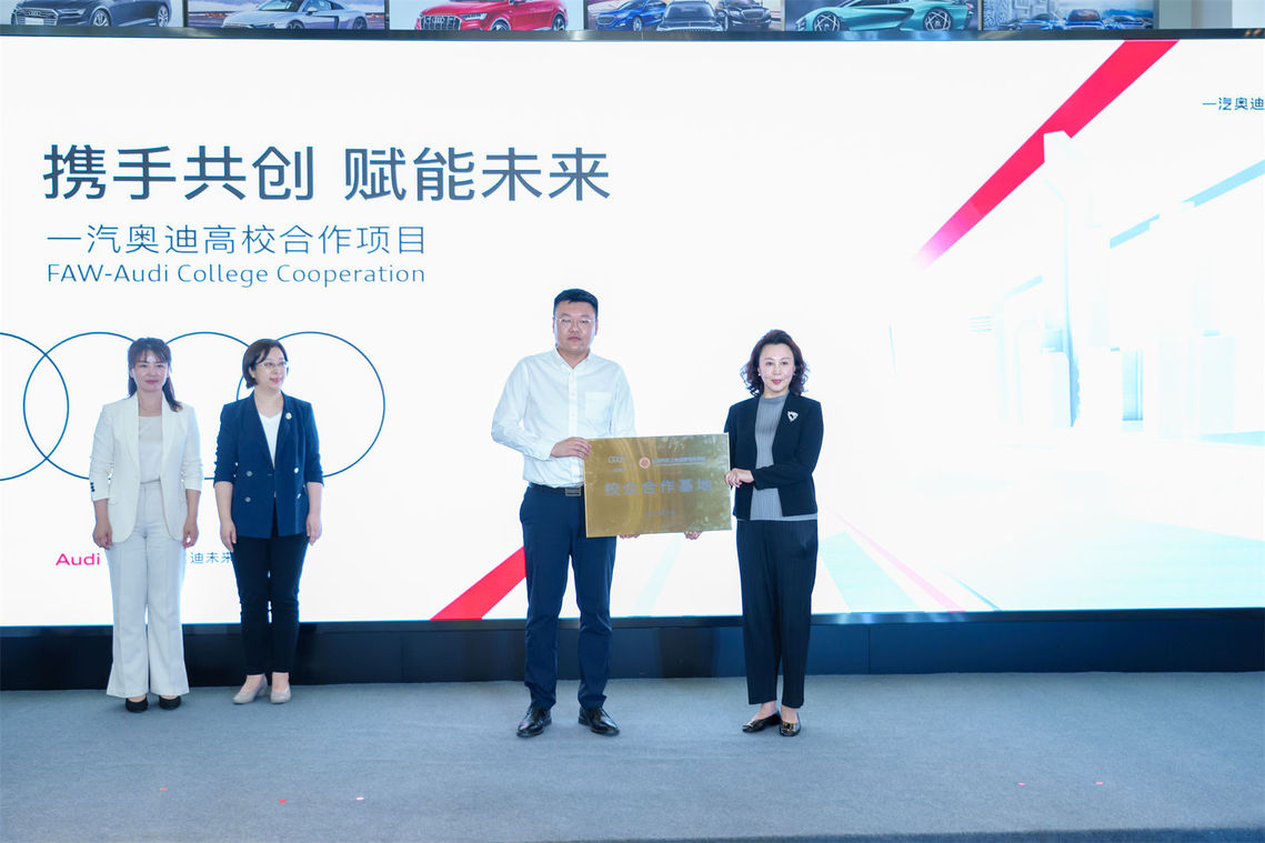 仪式上,校企双方领导顺利签约并为基地授牌,这标志着我校与一汽奥迪产教融合的进一步深化,也为今后双方携手共创赋能未来打下了坚实基础。