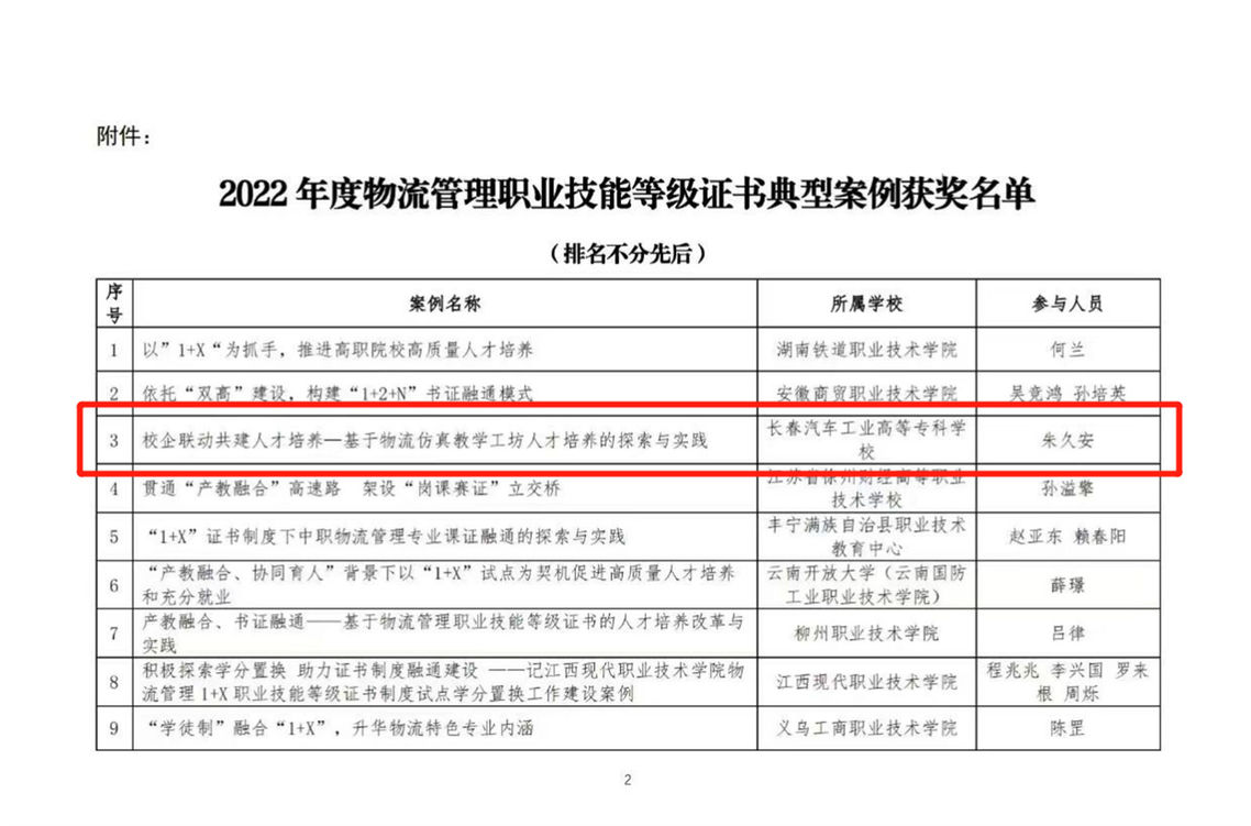 6月14日,北京中物联物流采购培训中心公布2022年度物流管理与供应链运营职业技能等级证书典型案例评选结果。我校教师朱久安申报的《校企联动共建人才培养——基于物流仿真教学工坊人才培养的探索与实践》案例,获评2022年度物流管理职业技能等级证书典型案例。