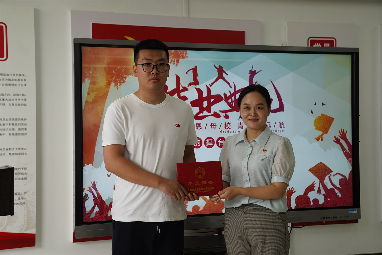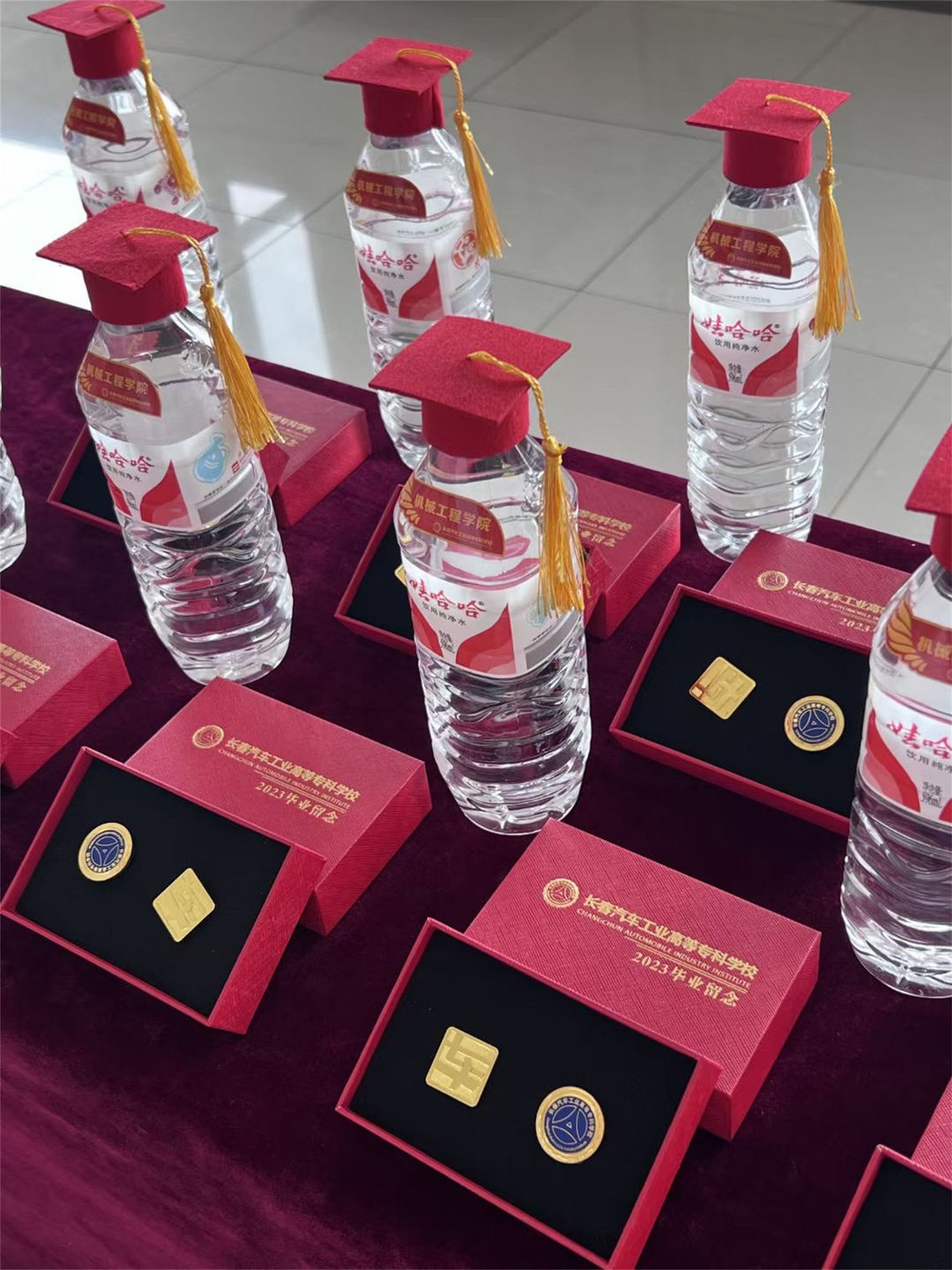 学院为优秀毕业生代表颁发毕业证书及毕业纪念品。学院还精心设计了“德能并进,知行合一”校训签名墙和主题拍照墙。希望每一位毕业生铭记今日誓言,肩负历史使命,坚定前进信心,争做堪当民族复兴重任的时代新人,书写独属于长汽高专学子的华彩篇章。