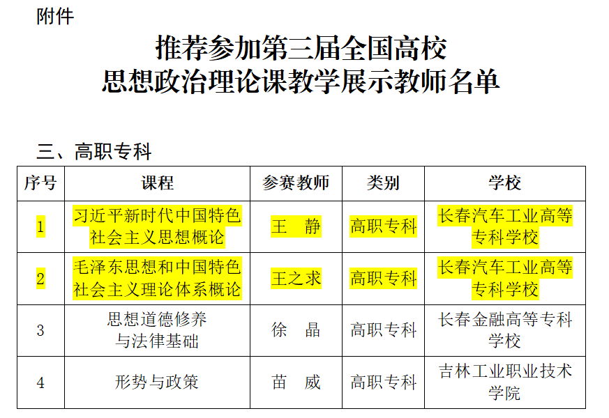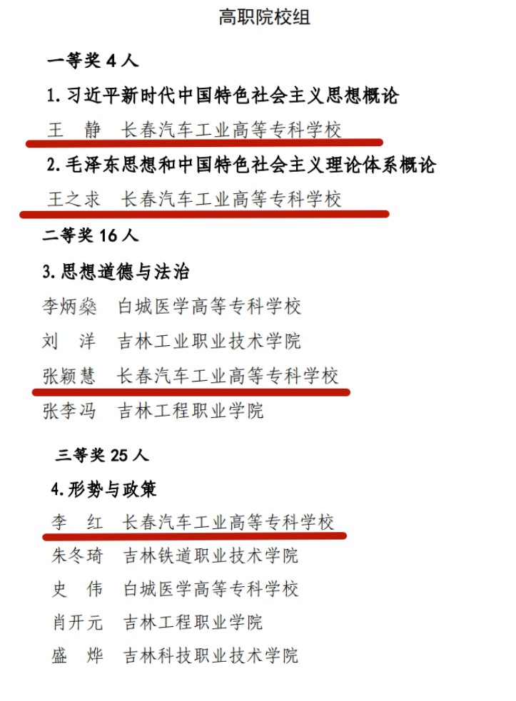 全省高校思政课“精彩一课”教学比赛是面向全省思政课教师的重要赛事,吸引了全省各大高校教师踊跃参加,我校教师王静获高职院校组《习近平新时代中国特色社会主义思想概论》课一等奖、王之求获高职院校组《毛泽东思想和中国特色社会主义理论体系概论》课一等奖,张颖慧获高职院校组《思想道德与法治》课二等奖,李红获高职院校组《形势与政策》课三等奖。王静、王之求两位教师被吉林省教育厅推荐参加第三届全国高校思想政治理论课教学展示。