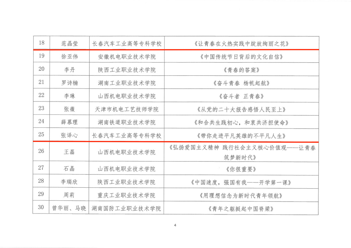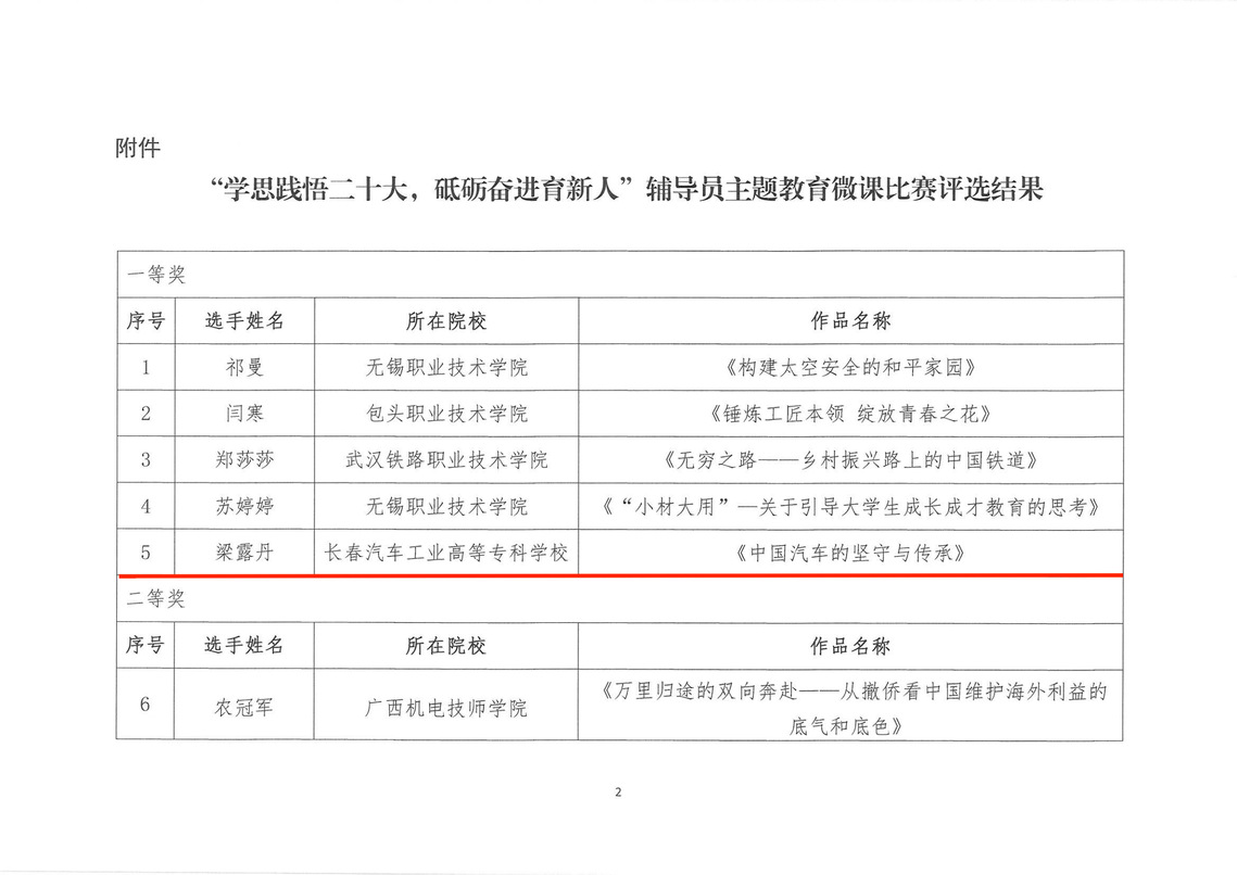 近日,由中国机械政研会机械职业教育思想政治工作研究分会主办的2023年“学思践悟二十大,砥砺奋进育新人”辅导员主题教育微课比赛获奖结果公布,我校辅导员梁露丹微课作品《中国汽车的坚守与传承》荣获一等奖,范晶莹微课作品《让青春在火热实践中绽放绚丽之花》、张译心微课作品《带你走进平凡英雄的不平凡人生》荣获三等奖。