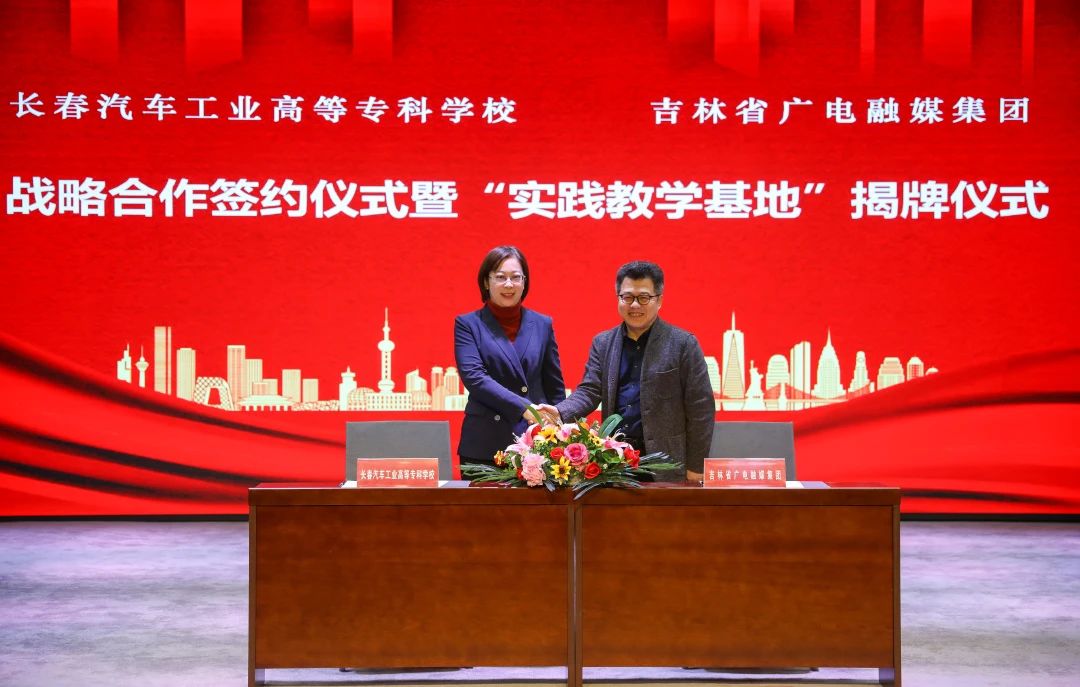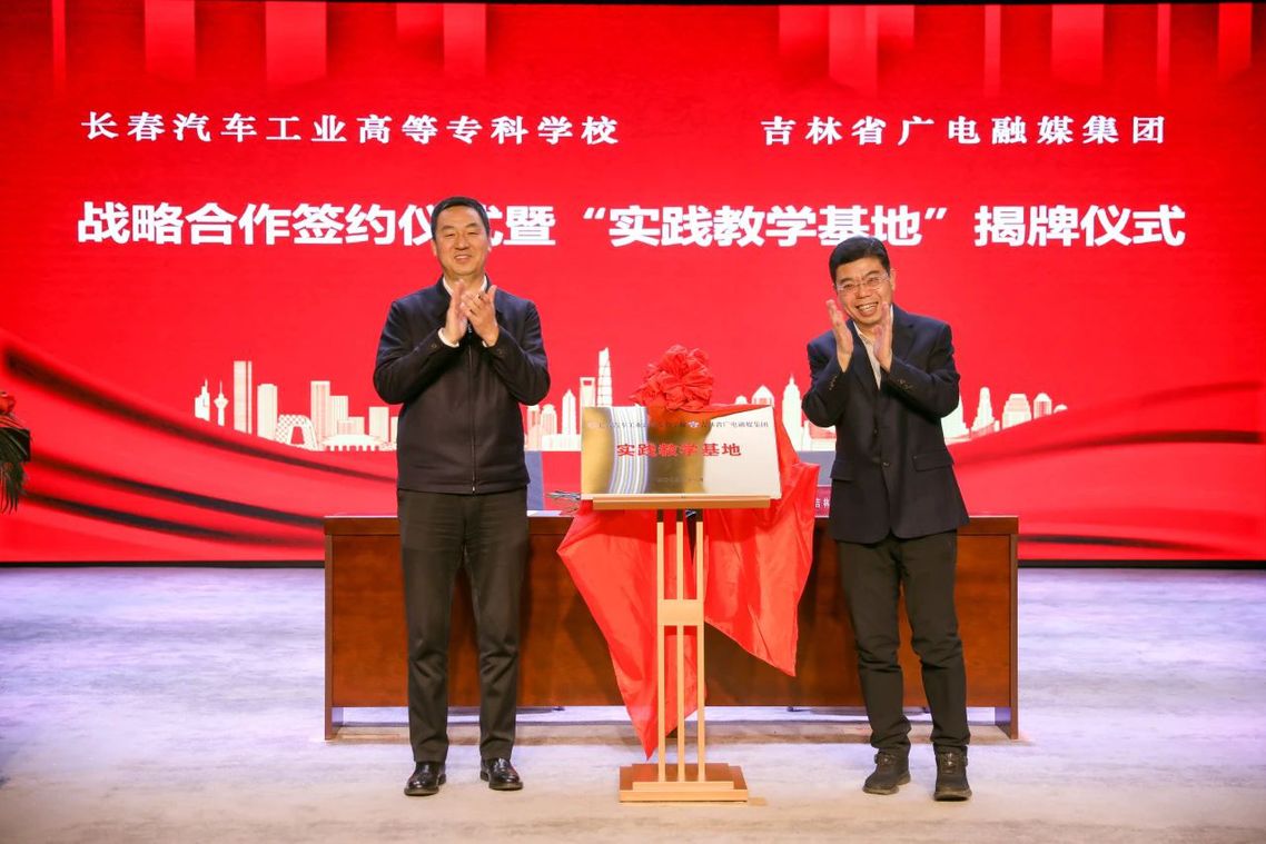 12月1日上午,我校与吉林省⼴电融媒集团战略合作签约仪式暨“实践教学基地”揭牌仪式在吉林省广电融媒集团多功能厅举行。我校党委书记安军、汽车营销学院院长任玲,吉林广播电视台党组成员、副台长周刚,融媒集团副总经理邓浩、谢宇辉,产教共建合作方代表云策集团董事长李彤、云策福祉培训学校校长于龙飞出席仪式。