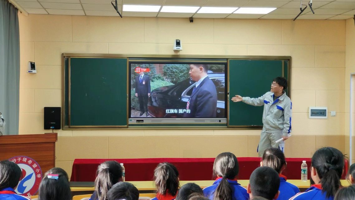 活动伊始,苏蔷带队与米沙子希望小学师生在学生教室开展座谈,希望以此次活动为契机,拓宽实践学习平台,建立长期共践促学联系,让学生更深入地了解汽车知识、红旗国车,立志为民族汽车品牌的强大发愤图强。