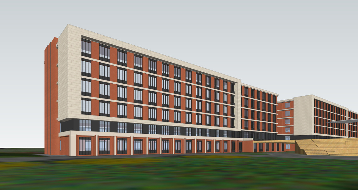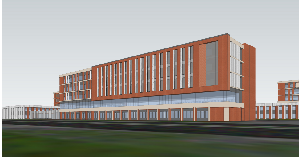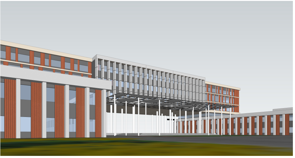 建筑物立面设计延续规划设计理念,整体材质以仿红砖铝板、浅色铝板线条及玻璃为主。教学楼与宿舍利用浅色的横向铝板线条突出现代感,仿红砖材质元素突出建筑的文化感,局部嵌套的体量使立面丰富有节奏感。实训用房与食堂多为2层体量,立面更强调阵列感与韵律感。整体立面造型简约大气又不失文化与精致感,保证建筑在未来使用中历久弥新。