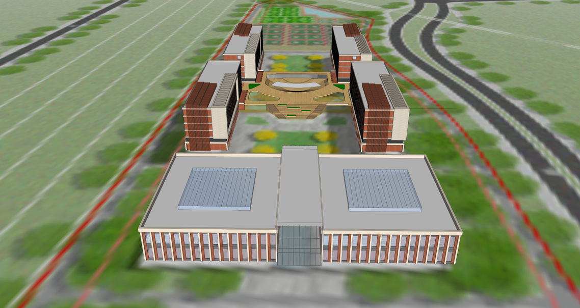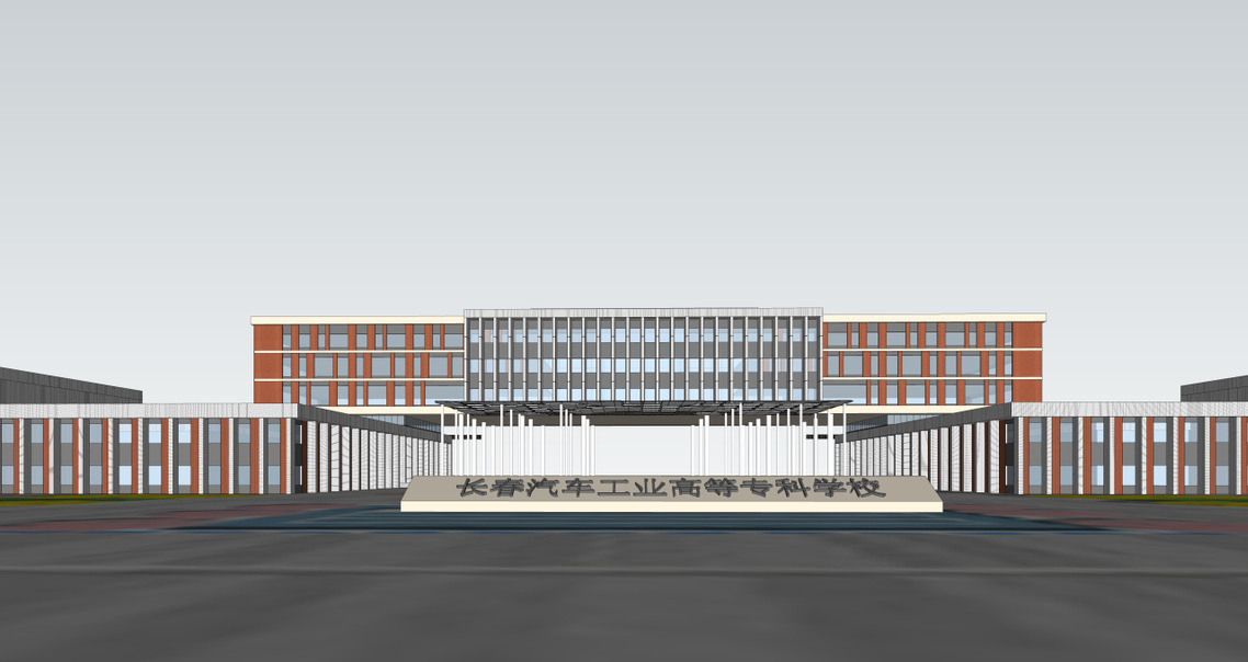 前程校区整体由西向东划分区域,西侧为教学区,中部为生活区,东部为运动区。教学区规划形态源于一汽集团企业标识,寓意一流高职,展翅雄飞。教学区结合校园大门,采用中轴对称形式,强调中正的仪式感,将汽车电子产业学院与新能源产业学院的一些公共教学空间合并在一个建筑体量内并架空处理,结合架空构造置入露天展示区,打造纵向中轴线校园标志性的建筑物,既使教学空间变化丰富,又注重校园入口视线设计。通过横向的景观轴串联各个景观节点,串联教学区,穿越生活区,连接运动区,构建绿色生态化的校园文化景观轴线。食堂位于文化景观轴线上,通过在食堂中间设置通过式的共享街,塑造出趣味的共享空间。宿舍区内置入一个多功能的开放式露天剧场,可营造充满年轻活力的居住氛围,为学生提供一个休闲放松的场所。运动区是集篮球场、羽毛球场、七人足球场、慢跑步道及极限运动场地为一体的多样化运动场地,适配当下年轻人喜欢的潮流运动类型。