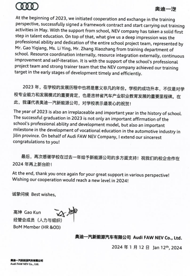 2月26日,奥迪一汽新能源汽车有限公司向学校发来感谢信。奥迪一汽培训学院经理Csoka Gergely代表企业对学校在人才队伍的建设与发展,以及学校在人才输送和培训培养方面的大力支持表示感谢。