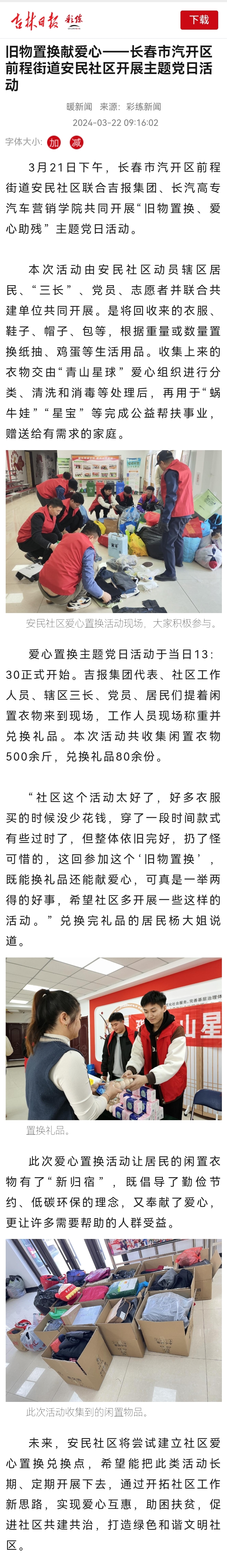 吉林日报——旧物置换献爱心 长春市汽开区前程街道安民社区开展主题党日活动
