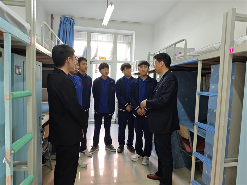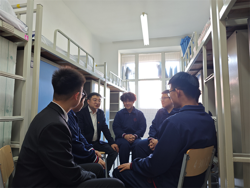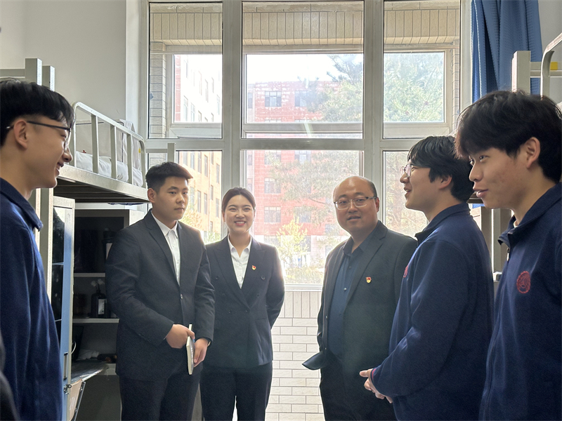 仪式结束后,党员教师们来到四公寓,与结对子寝室的学生亲切沟通,从思想动态、专业学习、行为养成、寝室卫生、心理疏导等方面了解学生,加强人文关怀、增进师生情谊。