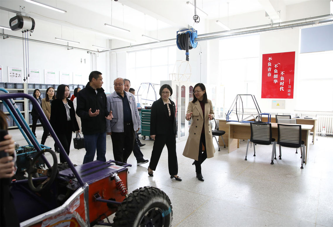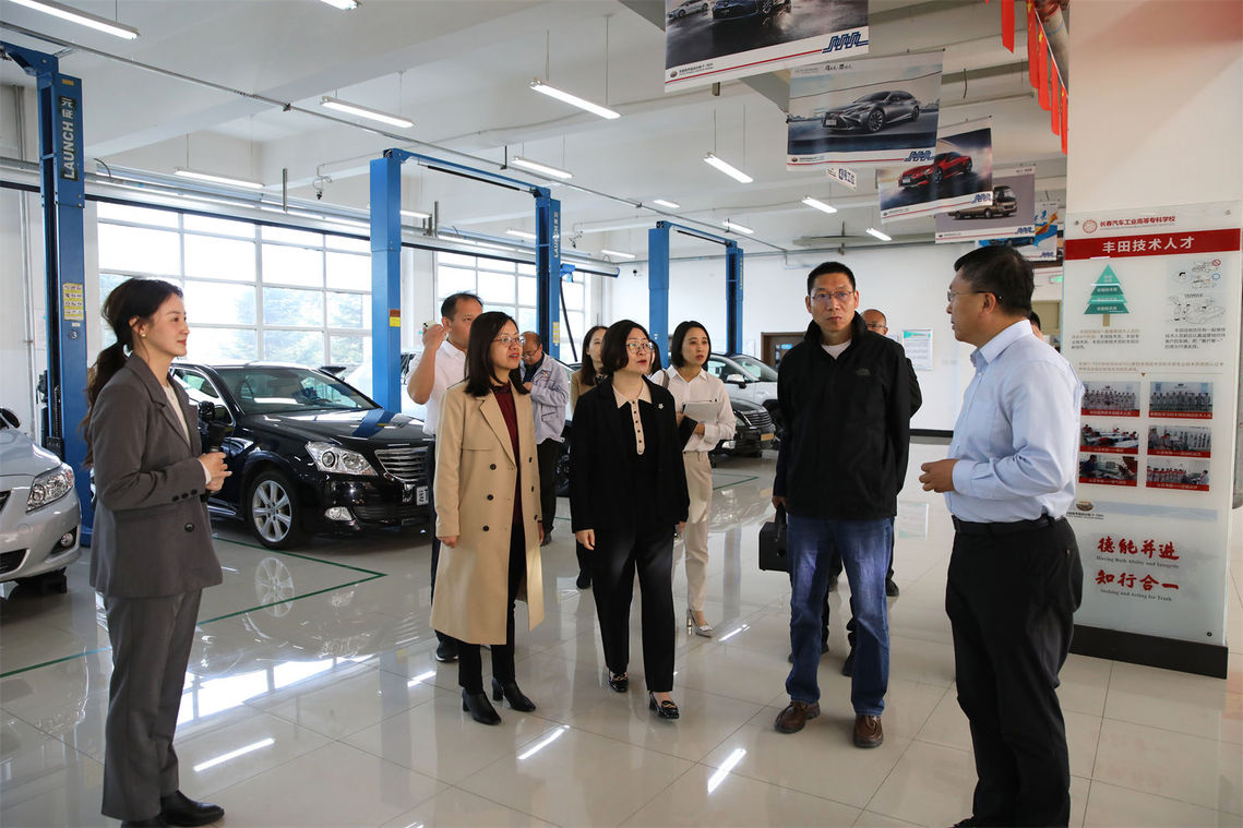 调研组一行先后来到我校红旗汽车品牌服务中心、融媒体中心、新能源汽车技术实训中心、AHK东北国际认证基地、智能汽车工程研发服务中心、智能制造协同创新中心等实地参观考察。在详细了解我校实训基地建设、人才培养模式等情况后,彭桂贞一行对我校产学研结合、教培一体方面取得的突出成绩给予高度认可。