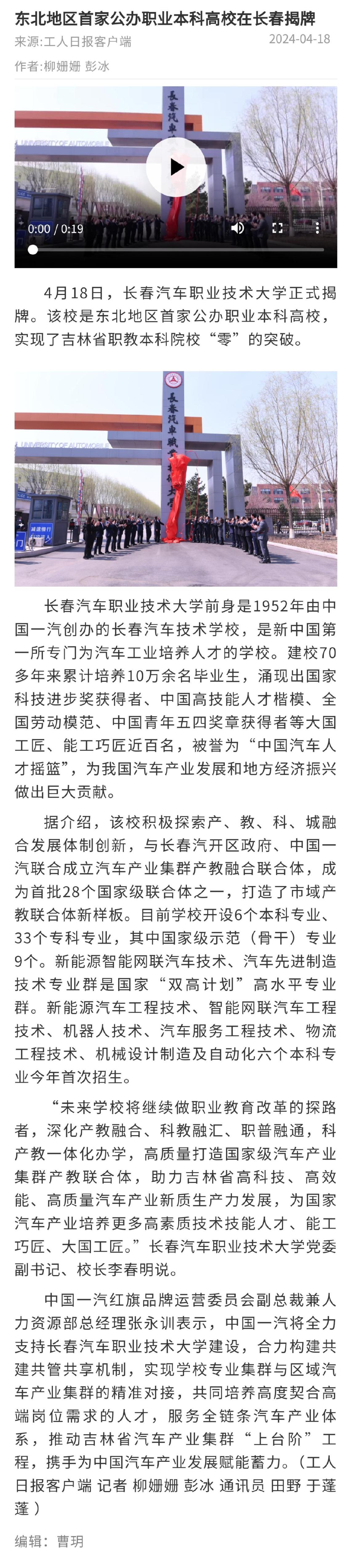 工人日报——东北地区首家公办职业本科高校在长春揭牌
