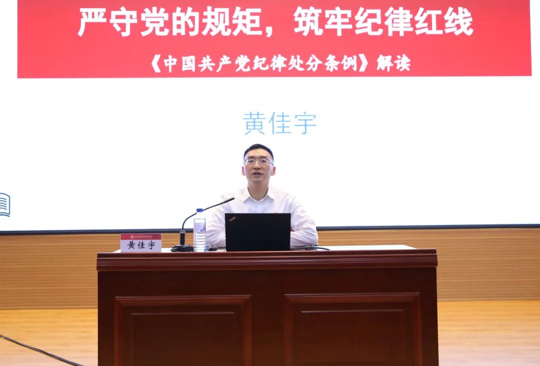 黄佳宇以《严守党的规矩,筑牢纪律红线》为题,围绕新修订的《中国共产党纪律处分条例》(以下简称《条例》),从《条例》的修订意义、主要内容、贯彻落实三个方面进行了全面系统地讲解,使广大党员干部进一步理解掌握了党的六项纪律的规定要求、执纪标准,更加明晰了纪律底线、红线、高压线,强化了纪律意识和自我约束意识。