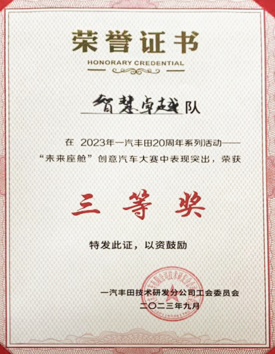 喜报 | 校企联合参赛作品“未来智能座舱-汽车座椅”荣获“2023年一汽丰田20周年系列活动——“未来座舱”创意汽车大赛三等奖